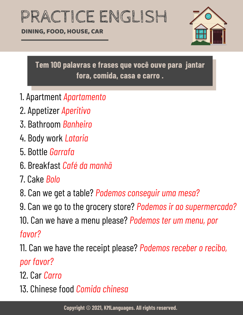 Vamos praticar inglês! Com este pacote você obterá 100 palavras e frases. Também inclui dramatizações para praticar conversas.